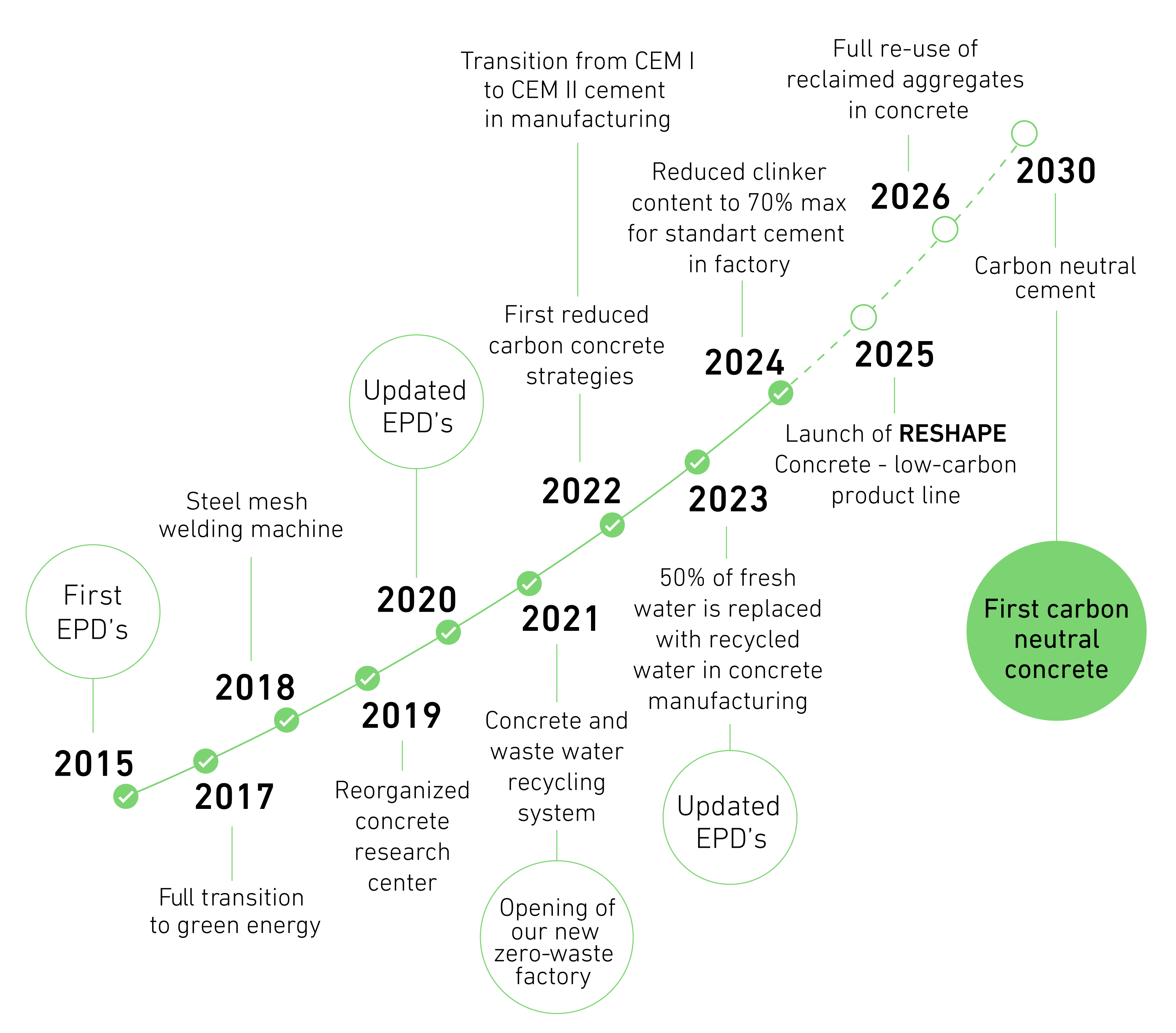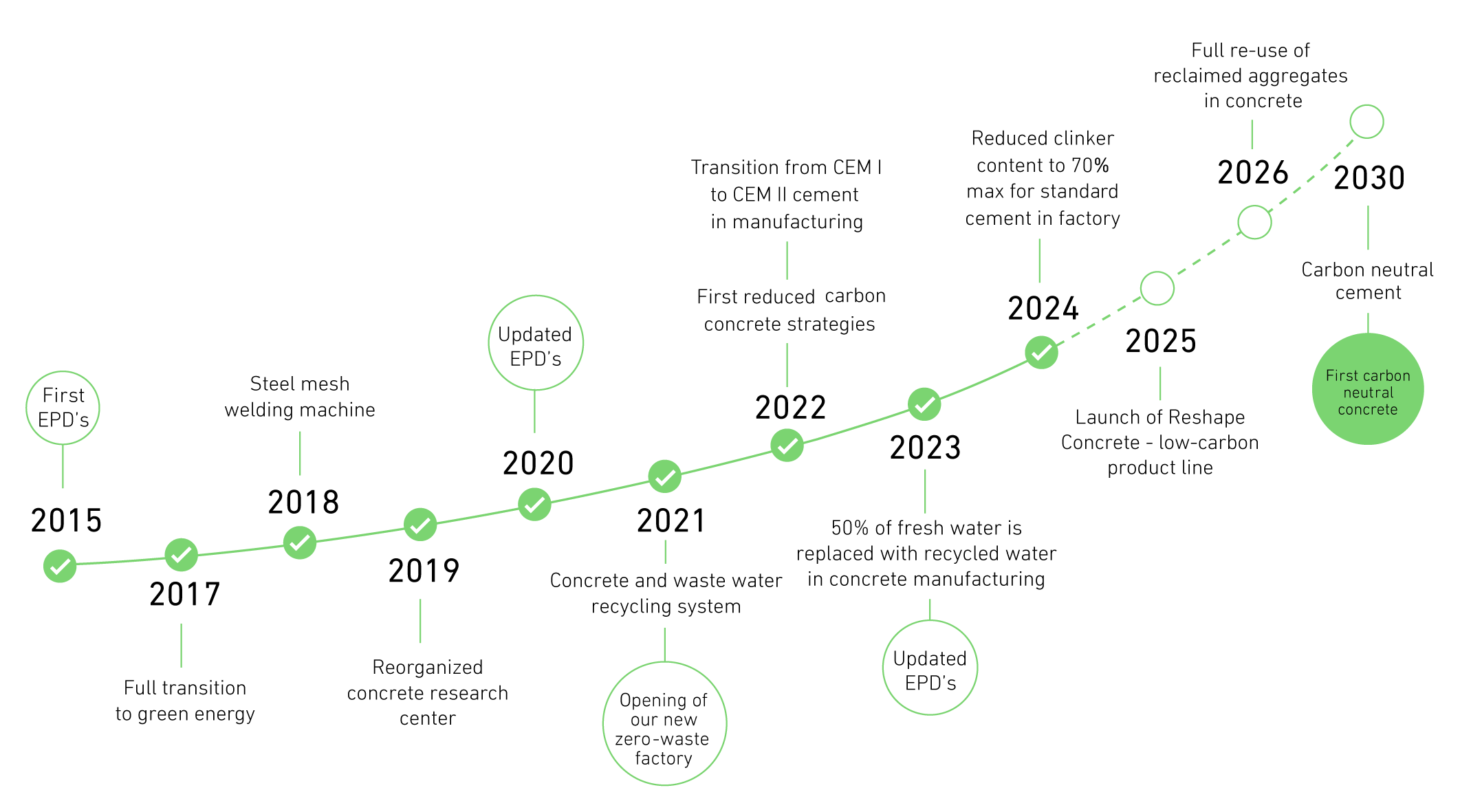 CO₂ reductions are achieved through actual changes in our facility and the way how we produce concrete — no offsets, just results.
